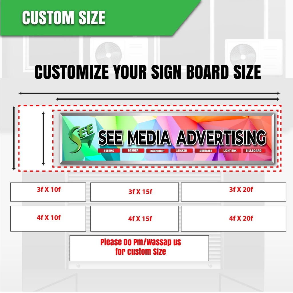 Signboard polycarbonate (standard size = 20ft x 4ft, 22ft x 4ft, 18ft x 4ft, 18ft x 3ft); Terdapat juga kedai yang lebih besar atau lebih kecil berbanding size standard. Ini adalah size standard untuk signboard kedai. All available types of signage!! 127 views, 1 likes, 0 loves, 0 comments, 1 shares. Hai bisnes owner area rawang yang nak buat signboard untuk kedai @ pejabat. Iskandar halal park, masai johor.✔️ — whatsapp admin untuk tempahan atau . Saiz papan tanda yang pelbagai dan tidak mengikut ruang peletakan. (dmiaprinting) signboard kedai langsir dan perabot saiz . Mudah dengan print ikut saiz signboard dan kemudian roll jer di atas plat tanpa perlu membuat